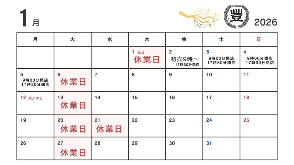 1月2日(木)初売り:午前9時より営業いたします。